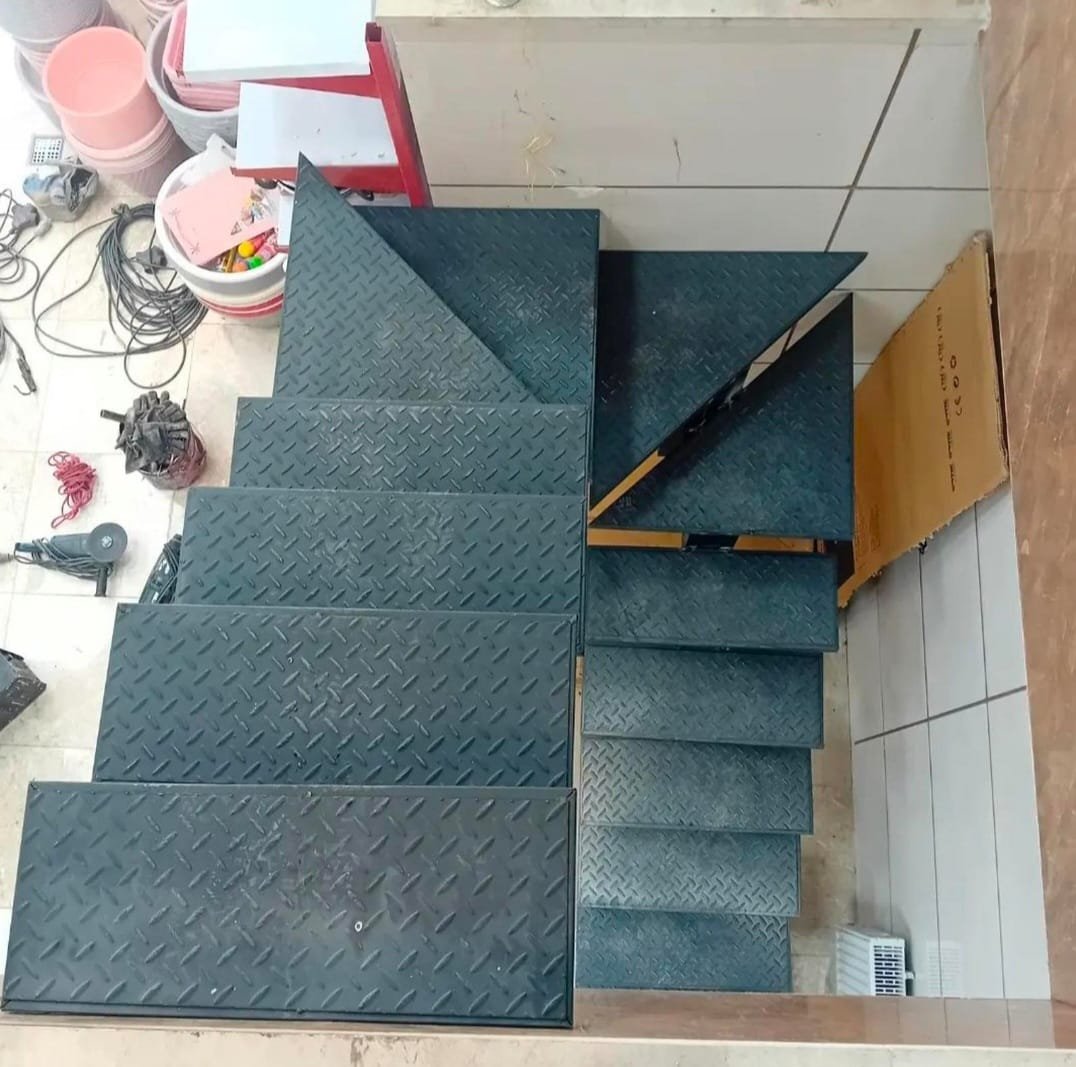 Material Anak Tangga: Plat bordes baja (berpola kotak-kotak atau diamond)